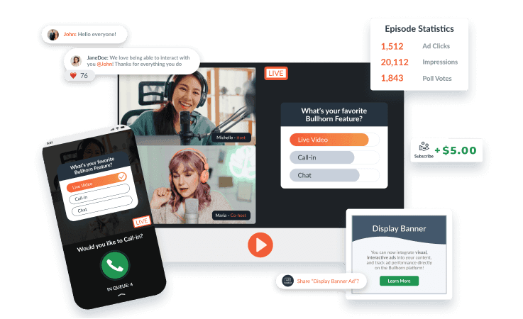 Whether you like to record or go live, your content on Bullhorn stands out. Connect your RSS feed, bolster your existing content, and invite your audience to a live experience when you're ready.